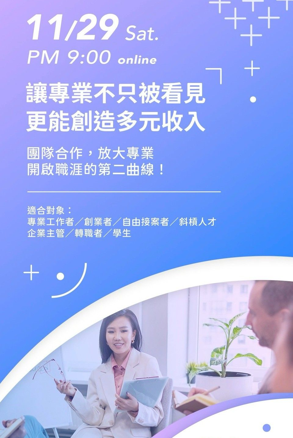 無論你是設計、攝影、行銷、公關、講師、顧問或編輯等專業工作者;正在累積多元收入的自由接案者與斜槓人才;渴望突破瓶頸的企業主管與創業者;或是正在探索方向的學生與轉職者